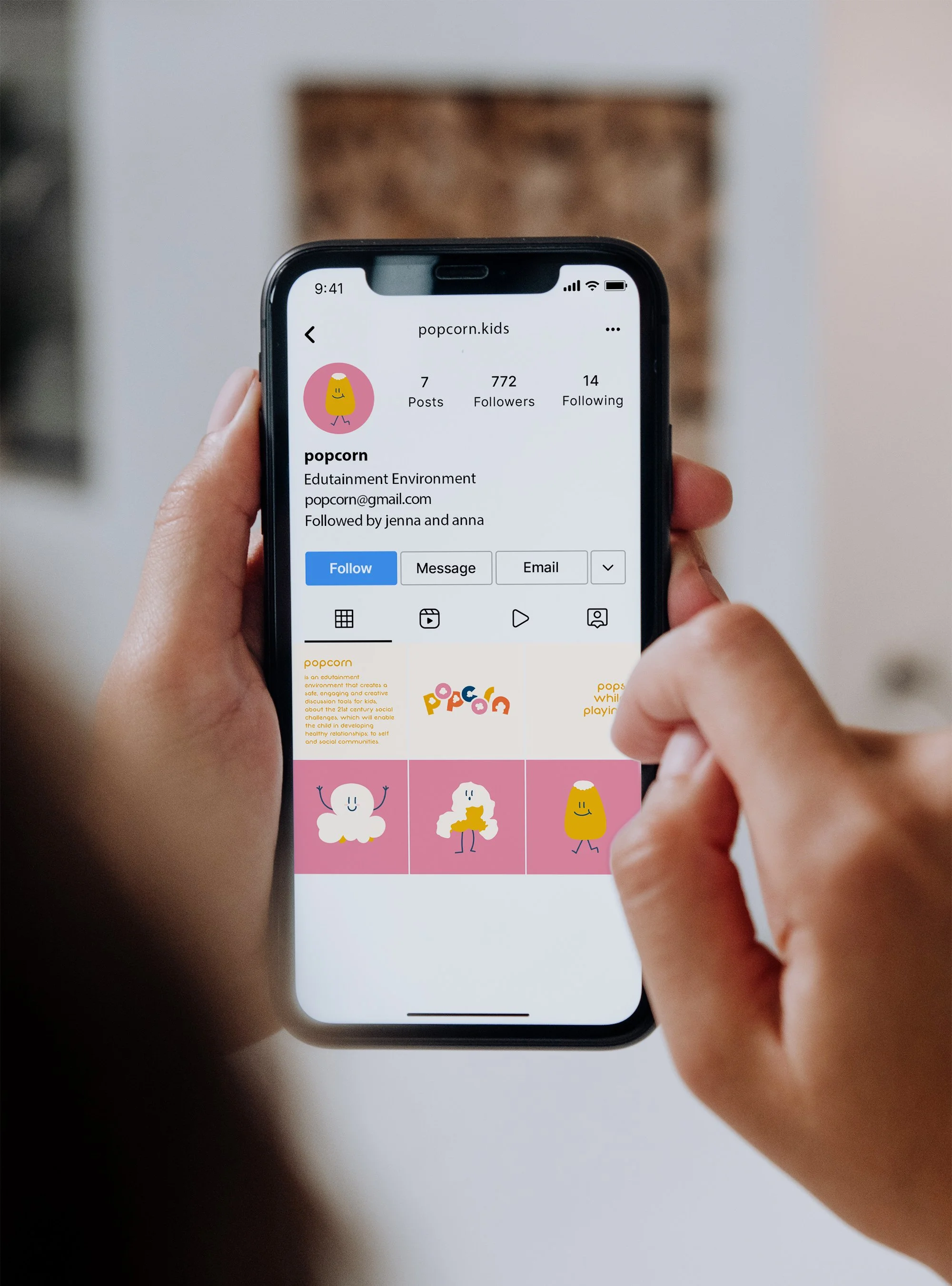 Popcorn logo uses a playful wordmark with letters arranged randomly to reflect fun and freedom, and the warm colors symbolize growth and trust.