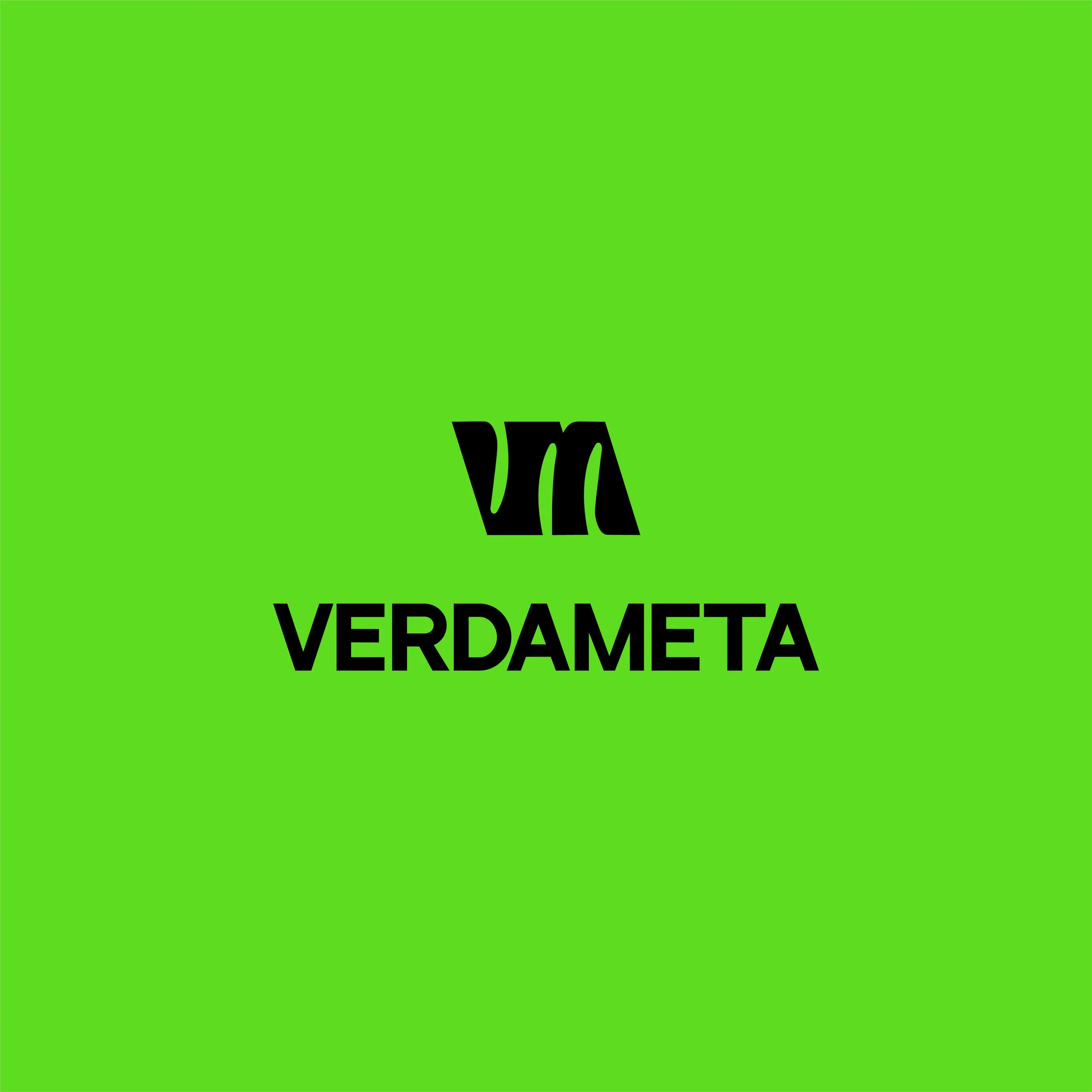 VerdaMeta is a social media app. The logo submark features a monogram combining the initials "V" and "M," symbolizing unity and growth within the community. The bold, playful typeface reflects youthful energy, while the slanted rectangle shape represents rapid expansion. The black and white color palette gives a modern, high-contrast look, with a pop of green to emphasize the brand's name and identity.